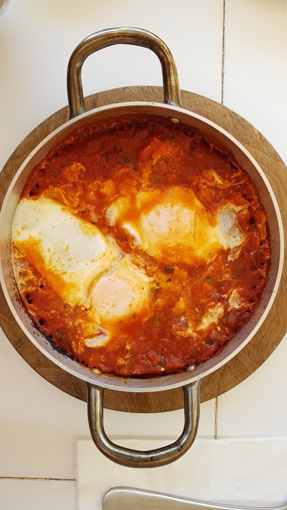 Шакшука, оливковое масло, сыры, селедка, овощной салат и свежий хлеб.