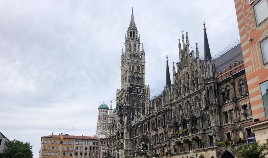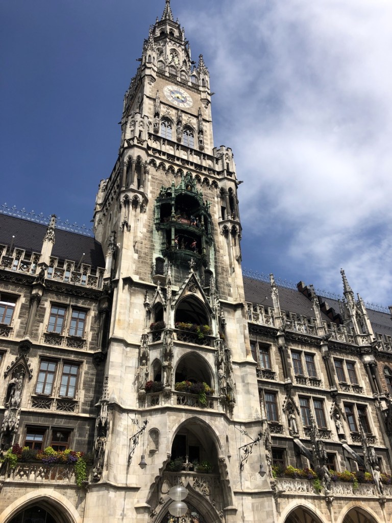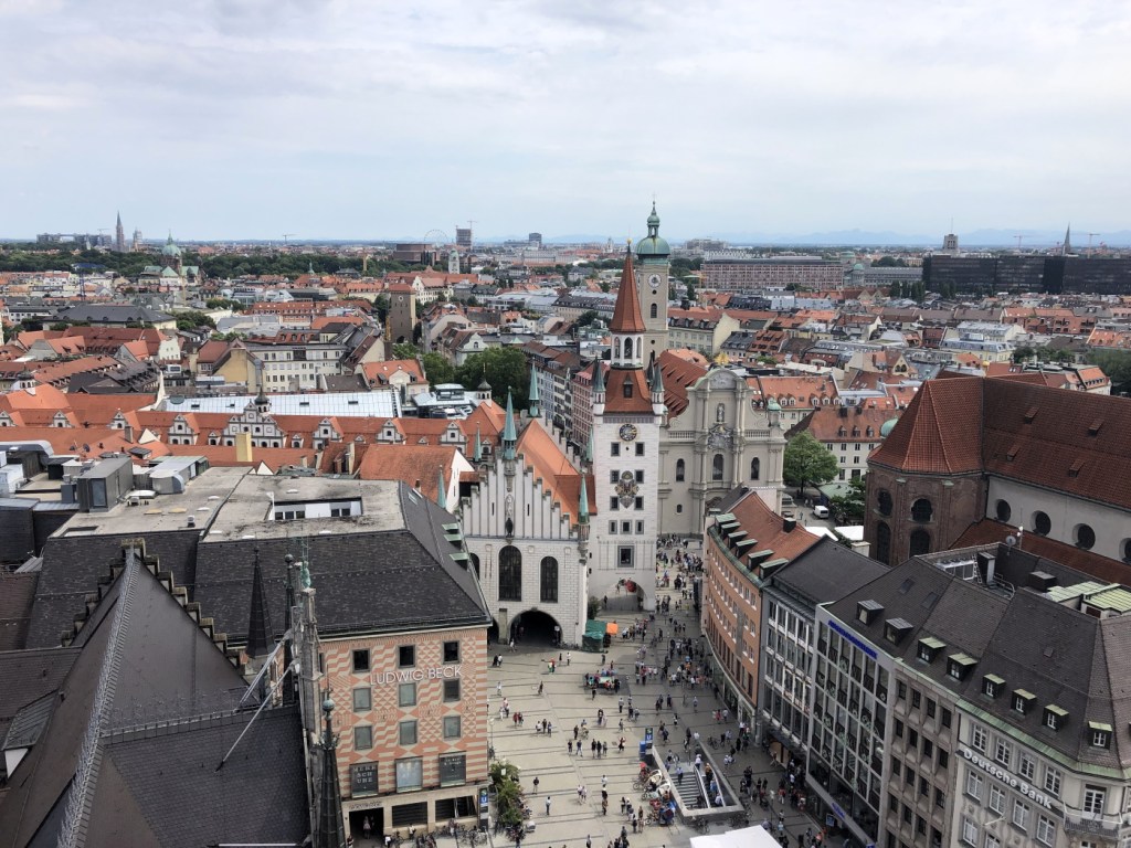 С высоты ратушной башни открывается удивительный вид на весь центр Мюнхена, высокие шпили католических церквей, площадь Мариенплац, улицы, заполненные гуляющими туристами и красные черепичные крыши средневековых домов.