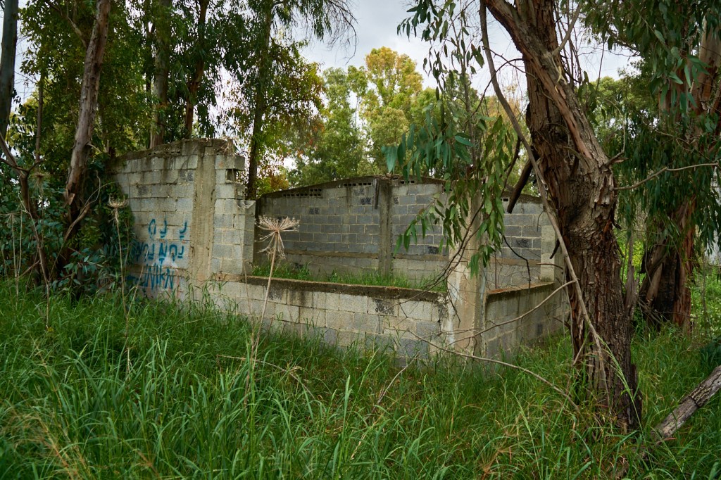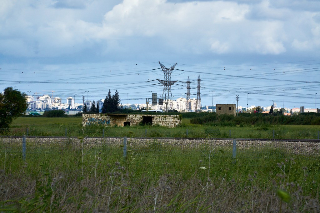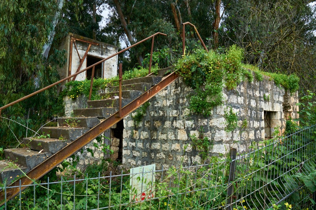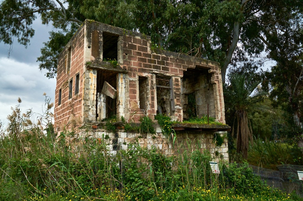 Выходим за ворота и идем по тропинке среди живописного поля. Справа видны старые заброшенные здания. Кстати, в этом парке находится первый бетонный дом, который был построен в государстве Израиль. Но в этот раз мы до него не дошли.